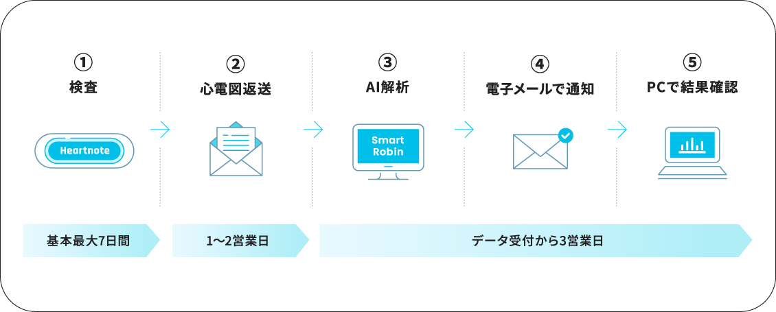本サービスは、電極一体型ホルター心電計 Heartnote®と当社のAI心電図解析ツール SmartRobin AI を連携させた心房細動早期発見支援サービスです。 循環器や不整脈の専門家でなくても簡単かつスピーディーに診断できるので、心房細動の早期発見に大きく貢献します。