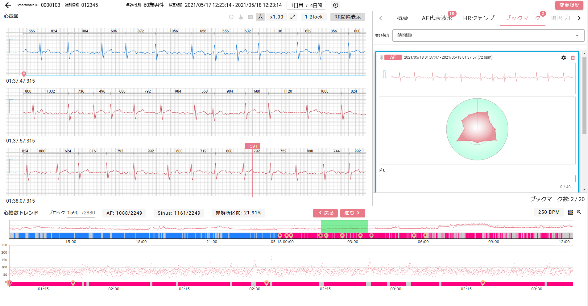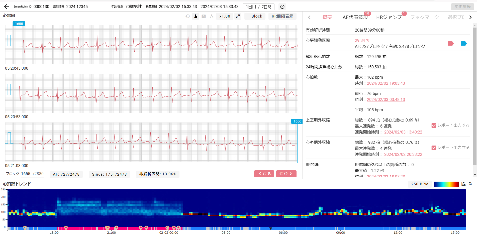 - 波形および心拍数トレンドの組み合わせで心房細動の有無および発生状況の確認が可能